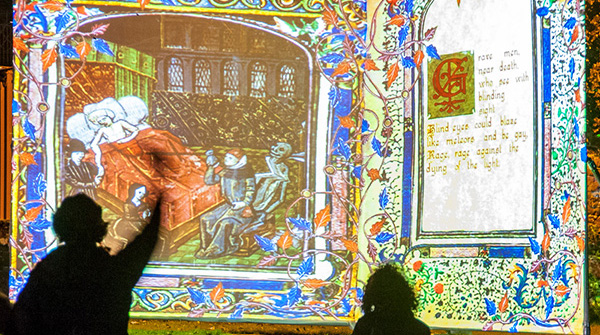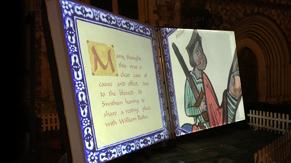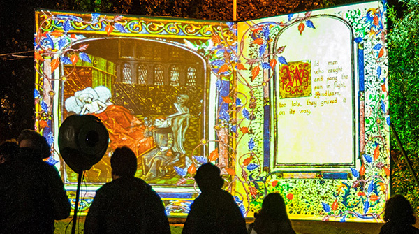 The open book glows in the night sky and uses cutting edge technologies to update the age old wonder of story-telling - some tales are true, others a bit harder to believe. This substantial outdoor projection piece is inspired by the early Illuminated Manuscripts. Like them it combine words with pictures to dazzle the viewer.