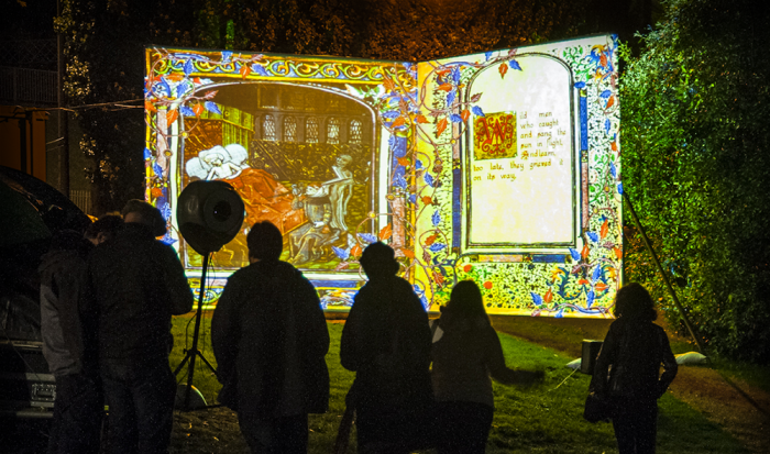 all hands to the pump to create a brand new piece for Blinc digital arts festival, a giant illuminated manustript full of poetry and images that are puppeted by audience members via a 3-D camera