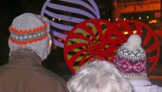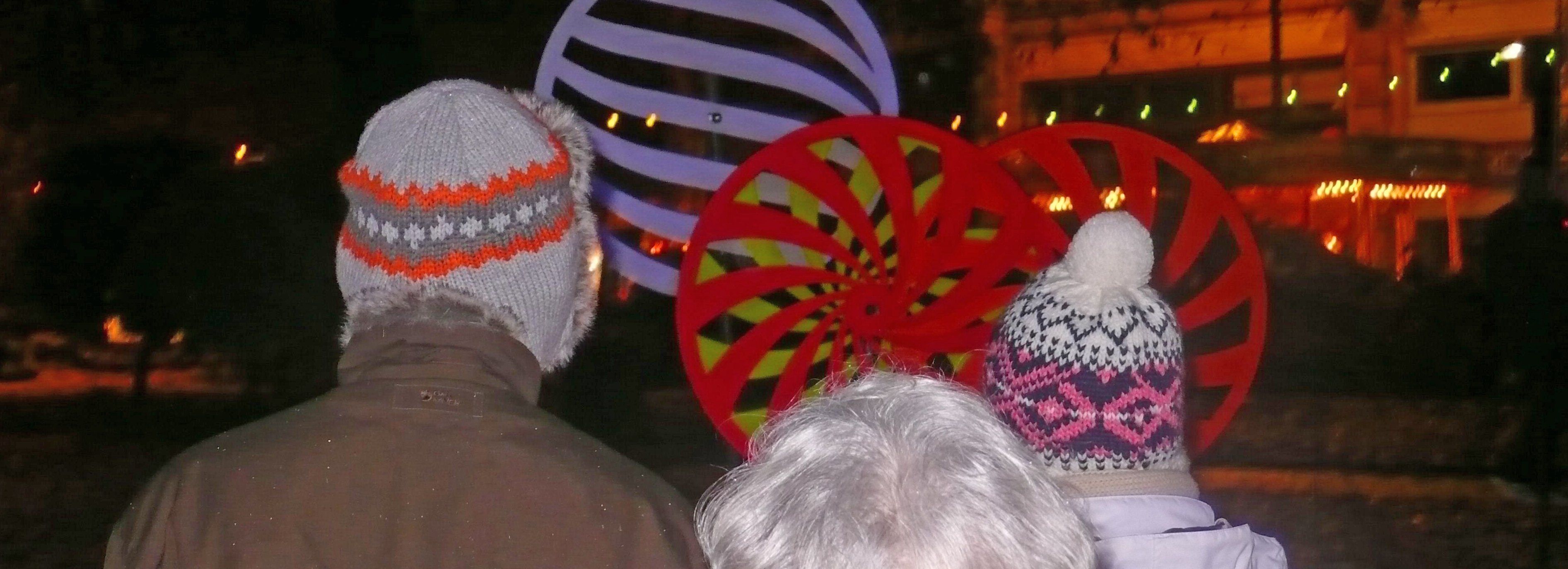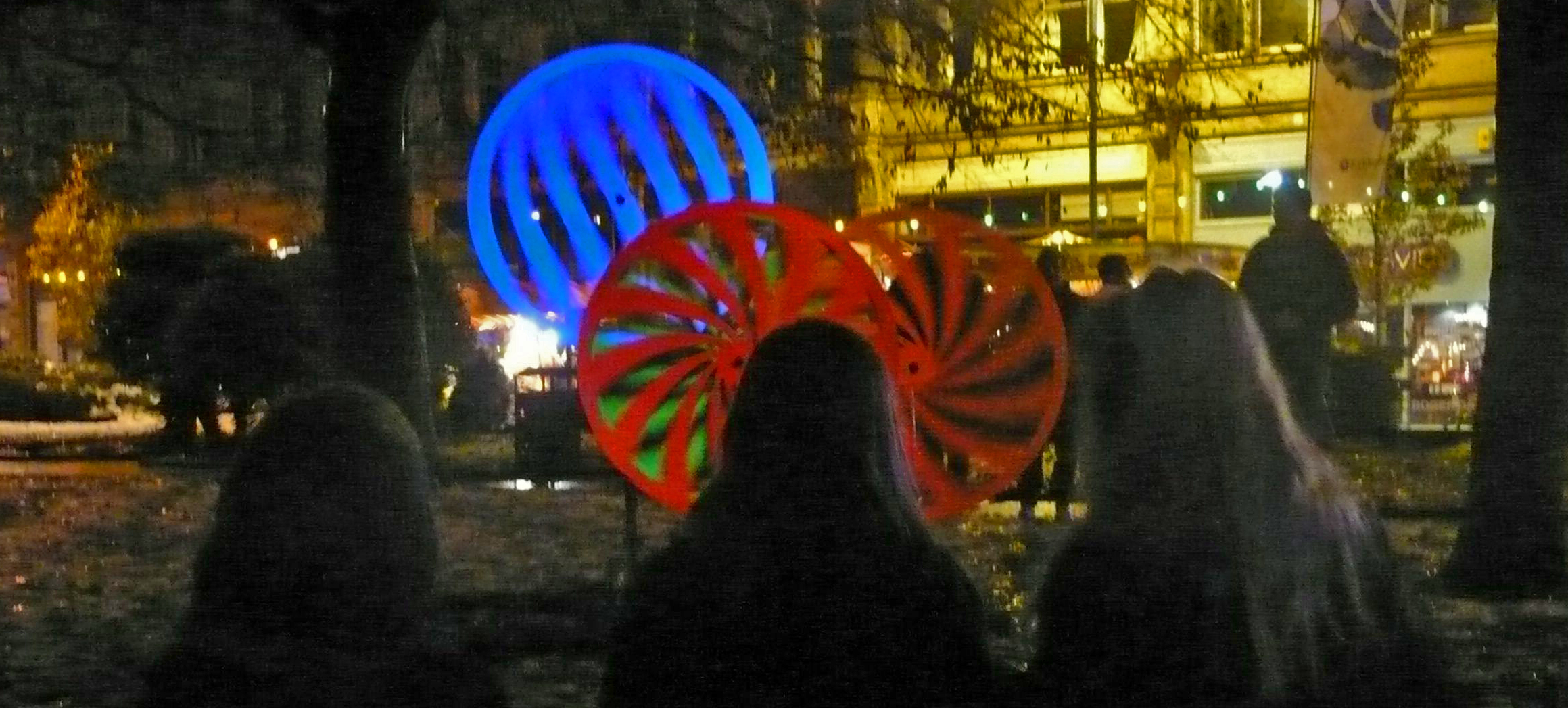 A kinetic sculpture made up of spinning disks, together creating a mesmeric and ever moving Moiré optical effect all lit with ‘black-light’ ultraviolet lamps giving it an ethereal glow that intensifies as darkness draws in.