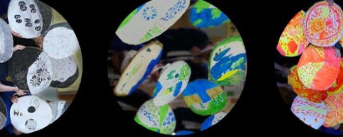 Ultra-violet hats representing the solar system constructed and performed with by Newsome Junior school.